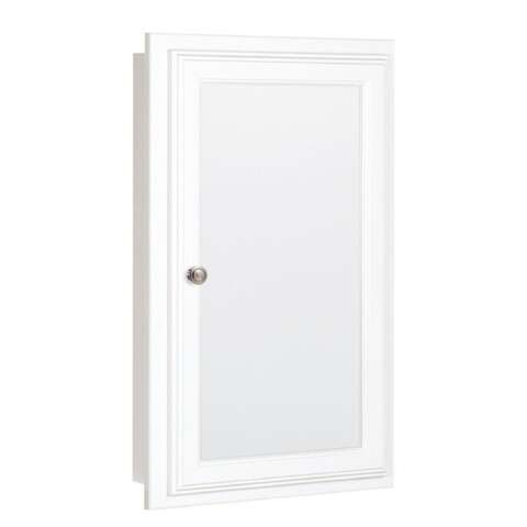 This swing-door medicine cabinet will bring fresh style to your bath. The glass mirrored door is enhanced with a decorative molded edge and the white finish coordinates well with most bathrooms.