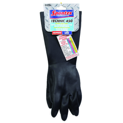 Professional grade neoprene rubber glove. Resists oils, acids, caustics, waxes, alcohols and solvents. High-tensile strength. Resists abrasion, cuts, sunlight, ozone. Embossed nonslip grip. Bacteriostatic flock lining retards perspiration odor.