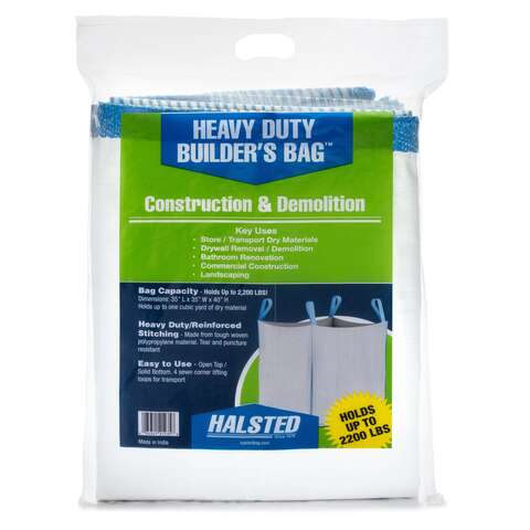 Heavy Duty Builders Bag- This bulk bag is 35 (length) x35 (width) x40 (height) with an open top and flat bottom. The bulk bag holds up to a cubic yard of dry material, and offers four lifting loops on the corners. Great for construction, demolition and landscaping. Use to store and transport dry materials. Removal of drywall, bathroom renovation and other home improvement projects. Mulch, dirt, rock and wood material.