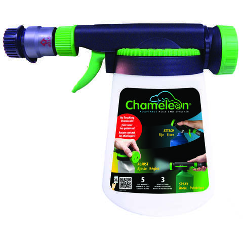 Hudson Chameleon Hose End Sprayer is designed to eliminate the need to touch chemicals. This sprayer has a reusable canister or it can be attached directly to the chemical bottle, with the adjustable concentration dial this product makes spraying pesticides and other chemicals safe and easy.