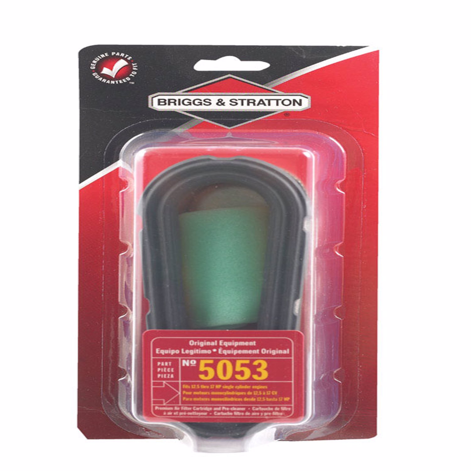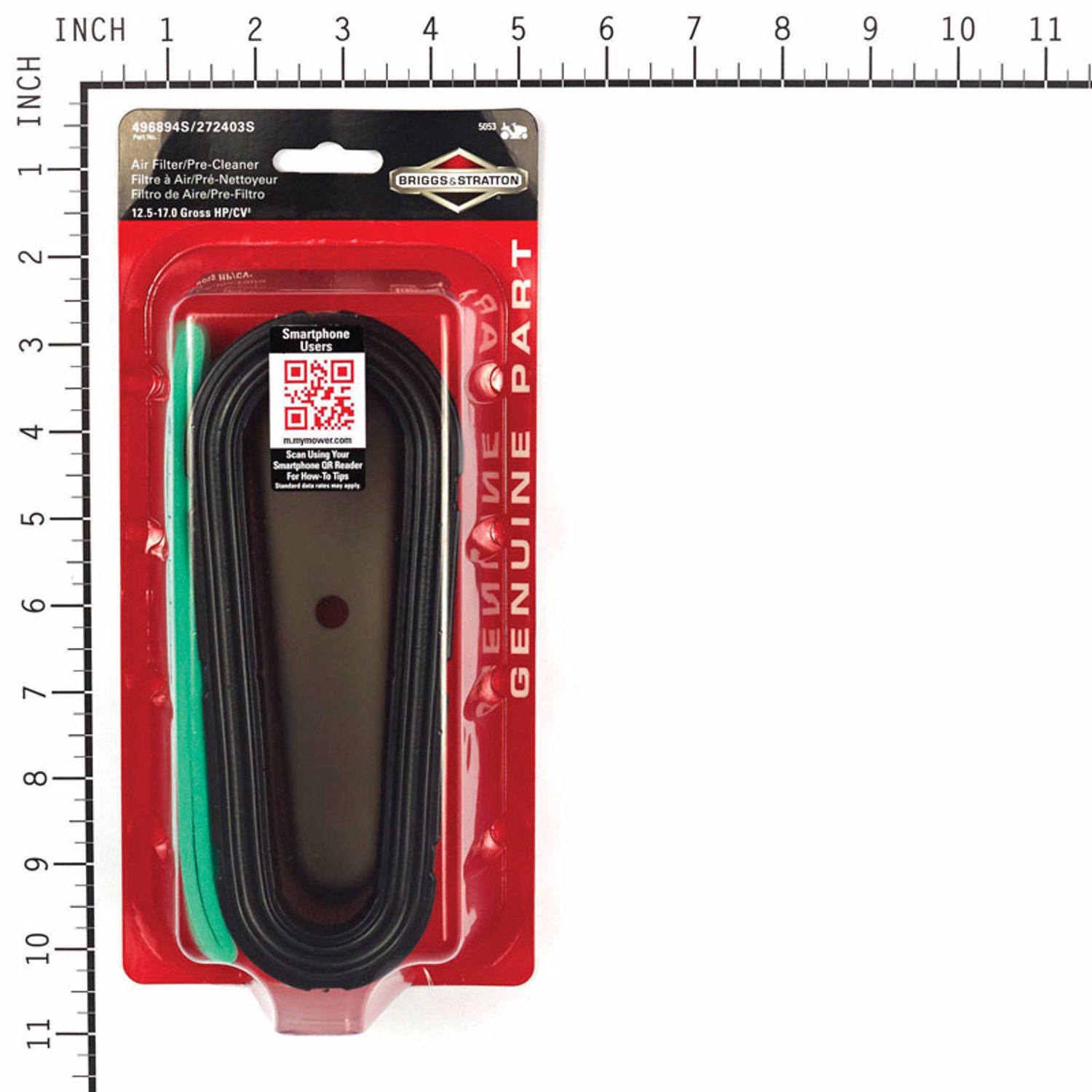 Display pack of 1 (496894S) air filter and 1 (272403S) pre-cleaner. This oval style, pleated-paper air filter provides superior protection against the destructive effects of dirt ingestion. Used on select 12.5 through 17 HP single cylinder engines, this OEM part ensures proper fit and performance to maintain the life of your Briggs & Stratton engine.Properties