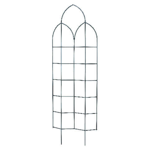 Glorify your garden with the Panacea Spires Trellis with Offset. A gothic inspired arch tops the trellis, with two smaller arches overlapping it. The horizontal and vertical support rods form a windowpane pattern. The rods are angled outward or inward, creating offset panels in the structure. This allows plants to be grown both behind and through the trellis for a thicker array of greenery. The metal construction will withstand harsh weather for several years, and the black color will blend into any surrounding. The Spires Trellis with Offset will elevate your garden style year after year.