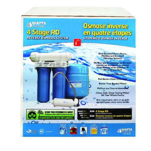 The Watts Premier four stage RO system begins with stage 1, a five micron sediment filter that traps particulate matter like dirt, rust, sand silt and sediment that will affect the taste and appearance of your water. Stage 2 is a five micron carbon block filter that provides a reduction of chlorine, chloramine and other materials that cause bad taste and odors. Stage 3 is the heart of the reverse osmosis system, the RO membrane. Stage 4 is a high quality GAC final filter (this is called a final filter because it filters after the membrane). The filtered RO water passes through the membrane and enters the storage tank. When you're ready for a taste, it will leave the storage tank and pass through this fourth stage on its way up to the faucet. The end result Crystal clear, high quality and great tasting water.