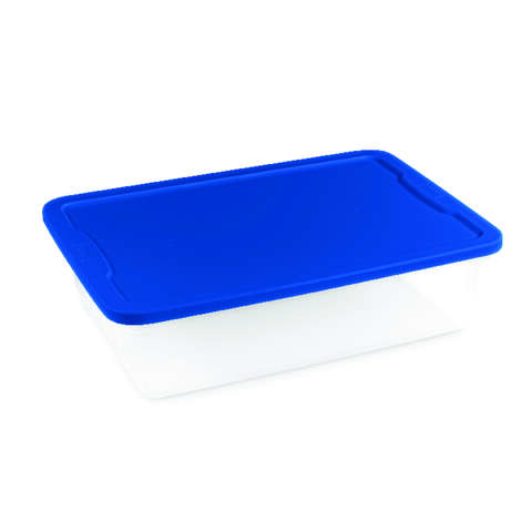 28 QUART STORAGE UNDERBED BOX, CLEAR BASE, BLUE LID. LID SNAPS SECURELY AND TIGHTLY SEALS TO BASE. SMOOTH SIDES AND MINIMAL DRAFT ON BASES FOR MAXIMUM USABLE STORAGE CAPACITY. ULTRA CLEAR BASE ALLOWS CONSUMERS TO EASILY IDENTIFY WHAT'S STORED INSIDE. MODULAR DESIGN WHERE SMALLER SIZES CAN STACK ON TOP OF LARGER FOR MAXIMUM SPACE UTILIZATION.