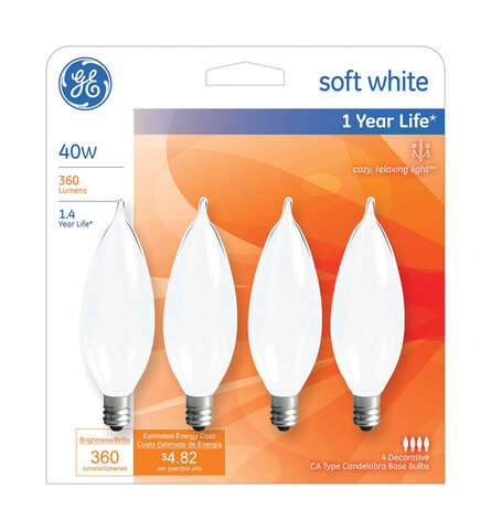 GE 40 W CA10 Decorative Incandescent Bulb E12 (Candelabra) Soft White 4 pk